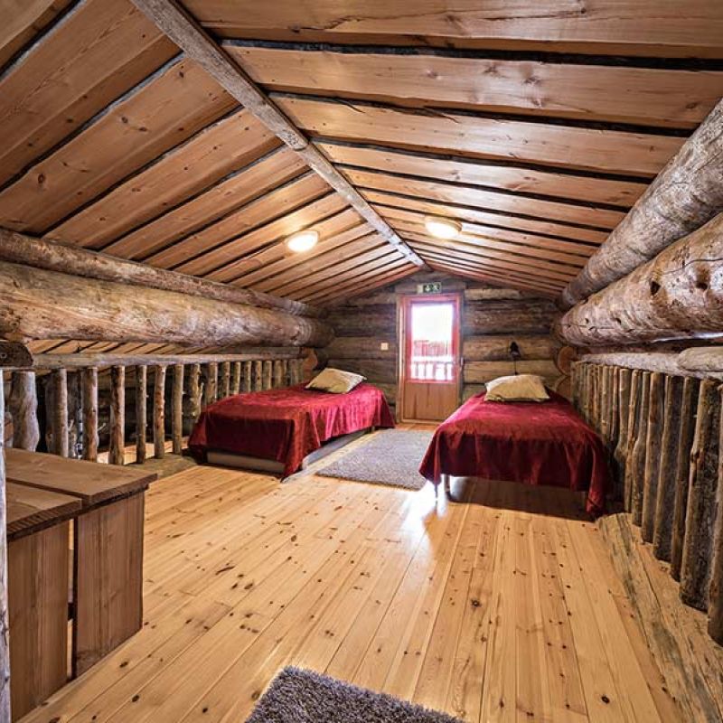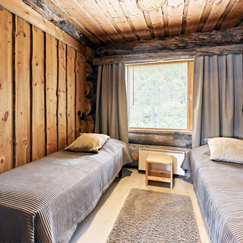 5 twin bedrooms and 2 single bedrooms (120cm beds), total 12 + 2 beds. Living room with fireplace, fully equipped kitchen, two seperate toilets, sauna department with showers and a toilet, loft.