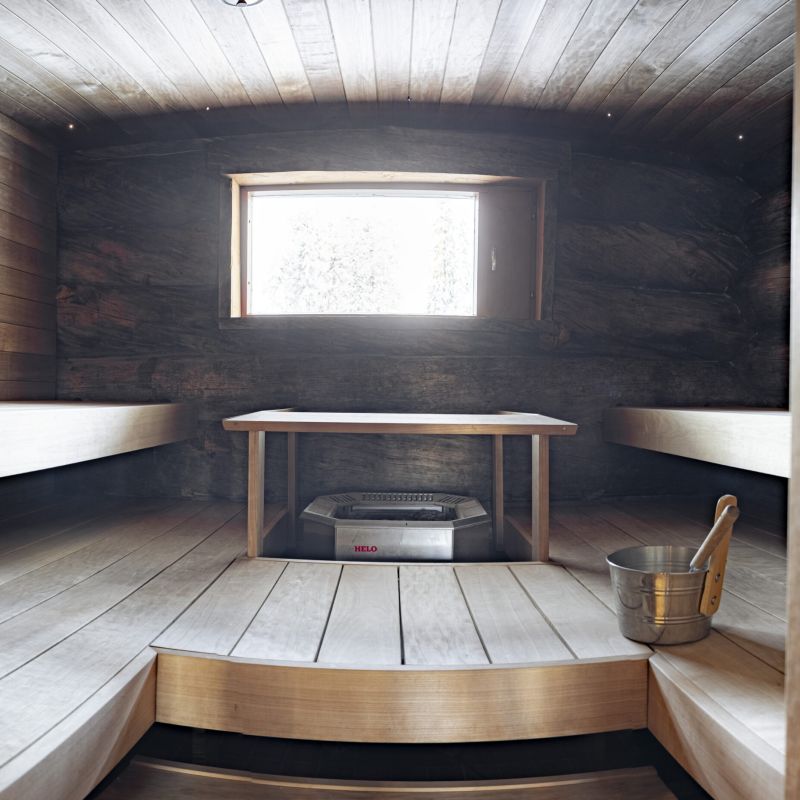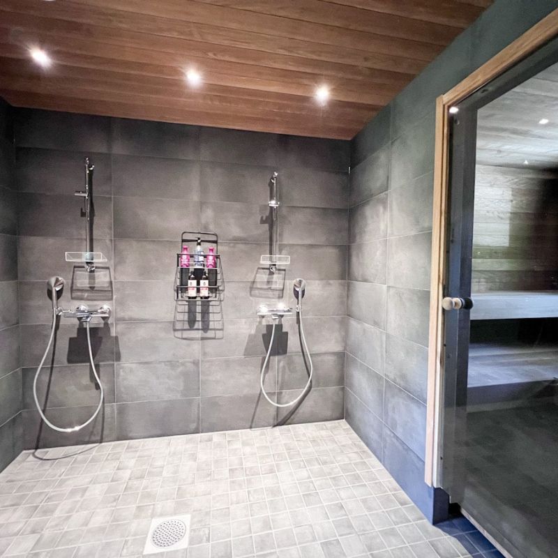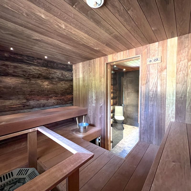 Living room with fireplace, fully equipped kitchen, sauna department with showers, seperate toilet, loft.